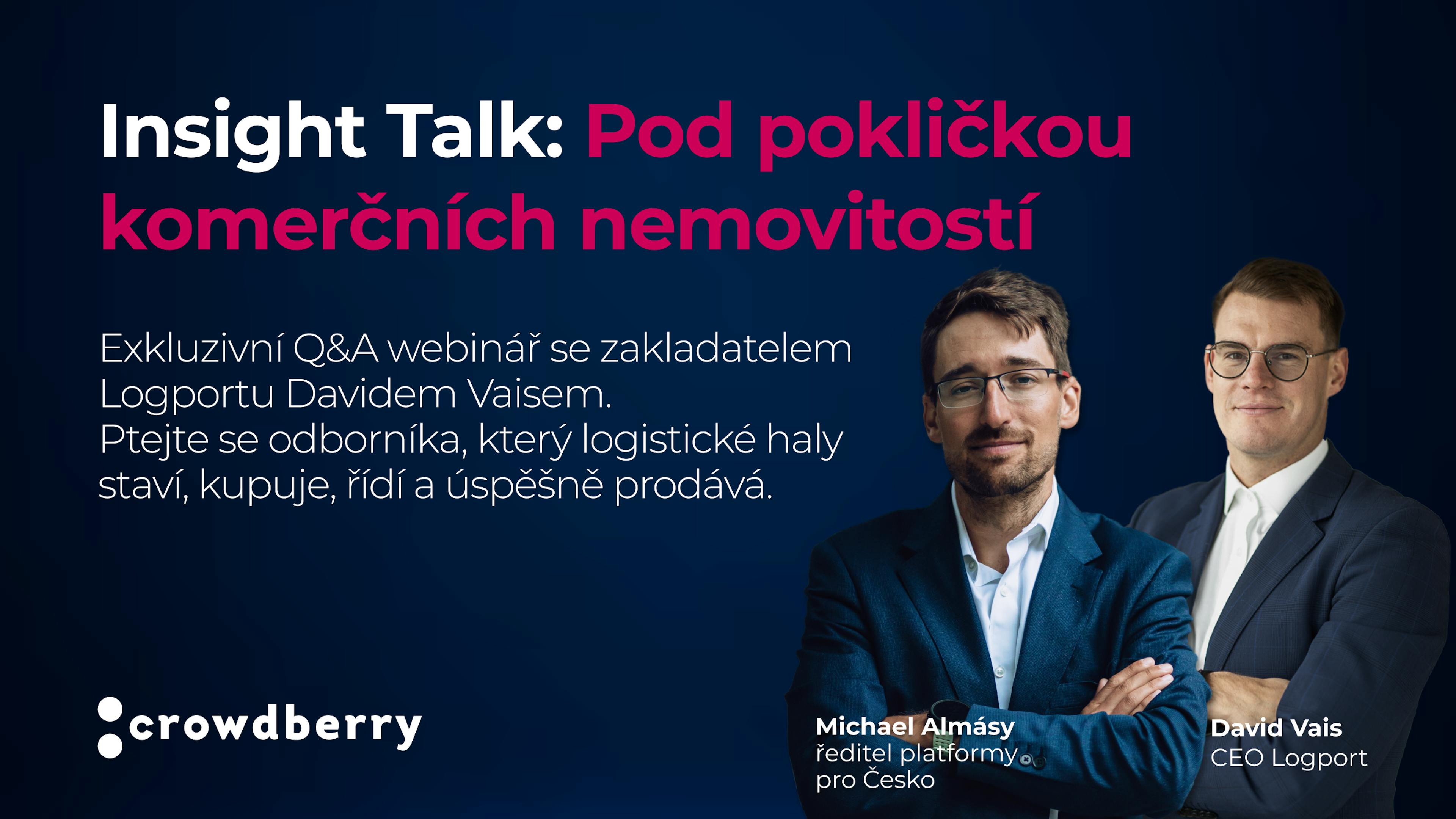 Přidejte se k nám na unikátní Insight Talk s Davidem Vaisem, CEO developerské společnosti Logport, a Michaelem Almásym, ředitelem platformy Crowdberry pro Česko. David se v segmentu komerčních nemovitostí pohybuje denně a v rámci Q&A webináře nám umožní nahlédnout přímo pod pokličku developmentu a správy hal, jako je ta u aktuální příležitosti Logport Kladno South.