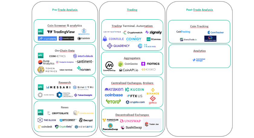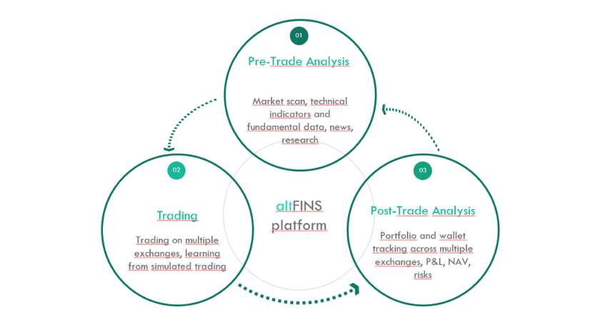 The altFINS platform seeks to bring efficiency to the digital asset investment process by covering the entire workflow from initial analysis through trade execution to post-investment monitoring of the portfolio. Most competitors focus largely on trade execution, but tend to neglect the analysis in the pre-trade phase, which is key to answering the question: "Which digital asset should I own, why, and when?"