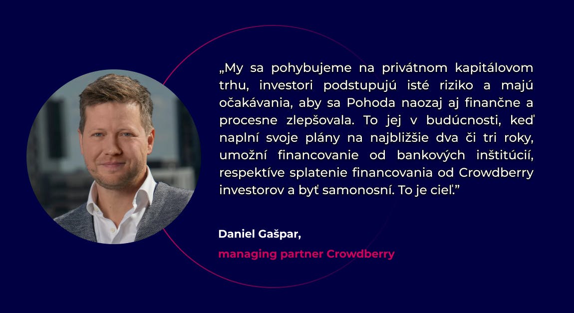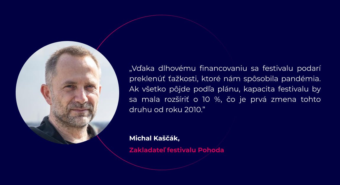"Vzhľadom na situáciu, v ktorej sme sa ocitli v postpandemických rokoch, sme uvažovali, ako budeme s Pohodou pokračovať. Aj keď sme mali niekoľko ponúk na odkúpenie festivalu, rozhodli sme sa vyhnúť najklasickejšej ceste a hľadali sme investičný prístup, ktorý žiadnym spôsobom neohrozí našu kontrolu nad festivalom, kvalitou služieb a jeho samotnou filozofiou. Práve preto sme vložili dôveru dlhového financovania, ktoré sa ukázalo pre nás ako ideálne,“ vyjadril sa Michal Kaščák, zakladateľ Festivalu Pohoda.